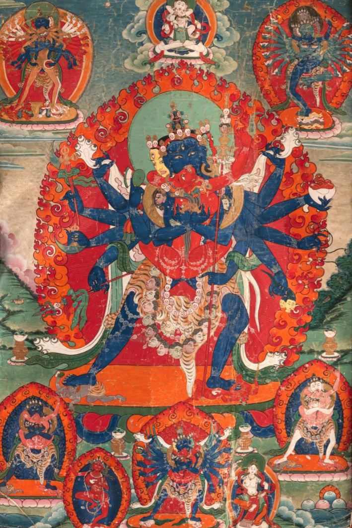 In the center of this meditation thangka, is the complex representation of the tantric deity Cakrasamvara in "loving" union with the wisdom partner Vajravarahi. This union symbolically includes "skillful means" as the masculine principle and "perfect insight" as the feminine principle. Skillful means are signified as compassion, and perfect wisdom and insight as the emptiness of all phenomena. Cakrasamvara is depicted in this painting as a twelve-armed apparition of iconographic blue color. The deity has four faces each crowned with a quintuple skull crown. The faces show an enraged expression, in a mixture of anger and passion. The twelve arms of Cakrasamvara symbolize the purification of the twelve limbs or stages of "Conditioned Arising" represented in the Wheel of Life (Bhavacakra), from birth to death. All twelve hands show different attributes or weapons. The two front hands, with which Cakrasamvara at the same time embraces his partner, hold bell and diamond scepter. These two attributes, held in the gesture of embrace, have the same meaning as the union of method and wisdom. With his playing on the hand drum, the deity enhances the supreme bliss experienced in the spirit of complete enlightenment. The dagger and the crooked knife cut through the three poisons, representing avarice, hatred and pride. The trident pierces the delusions of the three realms of existence. The staff (khatvanga) held upright in the arm symbolizes Cakrasamvara's insight into the emptiness nature of all phenomena. The skull bowl filled with blood represents the blissful wisdom that fills the deity's sublime mind. The rope expresses that Cakrasamvara binds himself and others to nothing but this experience of bliss beyond all suffering. The severed head of a worldly deity (Brahma) shows Cakrasamvara's liberation from all obstacles of delusion and attainment of enlightenment. His back is covered with an elephant skin, symbolizing the overcoming of ignorance. Around his loins he has wrapped a tiger skin. As jewelry he wears corpse ashes from the cadaver fields in the form of human bones, threaded into chains, and decorative ribbons for the limbs - symbols of transience. From the neck hangs a long chain on which fifty-one freshly cut off human heads are strung. These point to the fifty-one paths that mindfulness encounters in relation to the perceived phenomena. In a moving posture, the "Wrathful Lord of the Wheel of Supreme Bliss," as Cakrasamvara is also reverently called, stands with his right leg extended on the worldly wrathful god Bhairava, whom he has overcome, and his consort Kalarati, on whom he treads with his bent leg on his chest. His companion Vajravarahi is of red body color and has long black hair. With both legs she wraps around the loins of her partner. In her hands she holds her blood-filled skull bowl and a sickle knife. With the sickle knife she cuts up disturbing influences from the side of the ego, and the skull bowl is the expression of her blissful wisdom and insight into the emptiness of all phenomena. Vajrayogini, as she is also called, is sixteen years old and of beguiling beauty, youthful freshness and vitality. She is the "Diamond Practitioner", she is the wisdom of the inseparability of great bliss and emptiness. This wisdom aims to transform the confusion of ignorance, represented as a pig on the hub of the Wheel of Life, into insight. Therefore, Vajrayogini is also called Vajravarahi - the "Diamond Pig". Her attribute is a pig's head which she wears in the side of her hair, symbolically as an expression of the spirit poison - ignorance. Merged to the unity the pair of deities appears on a sun lotus, blazed by a flaming energy aura. Above the pair of deities, Vajrasattva is enthroned with his partner on a moon lotus. Vajrasattva is worshipped as the mythical Buddha of initiations in the mandalas, and invoked to purify negative karma and transgressions through body, speech and mind. To his left, the tantric deity Kalacakra stands on a solar lotus in union with the wisdom partner. The color of Kalacakra is blue. He has four faces, each with a third eye. The deity has twenty-four arms and two legs. The partner of Kalacakra is called Natsog Yum. Yum means partner or mother. She is yellow in color and equally has four faces, each with three eyes. In the right corner is the tantric deity Hevajra. He wears a skull crown on each of his eight heads and the fivefold crown of the Tathagatas. Hevajra looks smilingly into the eyes of his wisdom partner and holds her in love union. Her name is Nairatma "she who is without I". In the lower two corners two emanations of Cakrasamvara are depicted. Both are in union with the red-colored Vajravarahi and appear in blue and in red body color. In the center below Cakrasamvara presents himself as Heruka with Garuda wings. To the left of him Vajravarahi appears again as a single figure and to the right the Dakini Macig Labdön. She is considered the '"Vajra demon vanquisher". Tempera and gold on cotton fabric. Original silk satin mounting.