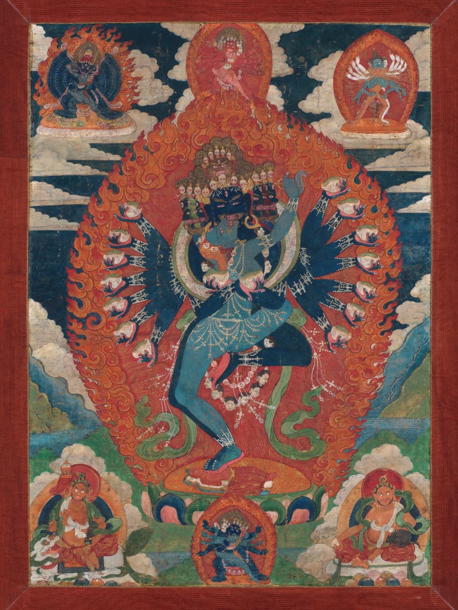 喜金刚为藏传佛教无上瑜伽部五大本尊之一,属无上瑜伽部母续,在藏传佛教萨迦派中格外受到重视。依照仪轨,其形象为八面十六臂四足:主臂二手交握于胸前拥抱明妃无我佛母,其余十四臂呈放射状向左右张开,手中皆持髅器。髅器内装不同神物,右边髅器内神物为白象、青鹿、青驴、红牛、灰驼、红人、青狮、赤猫;左边髅器内神物为黄天地、白水神、红火神、青风神、白日天、青狱帝、黄施财。前二足为展立姿,后二足舞立姿,踏于四位印度教神祇之上,代表佛法的四摄法(四种摄伏法门),对治障碍成佛的四魔。其明妃无我佛母亦展立姿,两臂上扬轻搂着佛父喜金刚,左手拿着颅碗,右手拿着金刚钺刀。主尊上方的金刚总持是本初佛,为三世一切诸佛的总身,座下有两位大成就者,两侧分别为时轮金刚和胜乐金刚。主尊四周环绕胜乐披甲六金刚母之披甲金刚亥母、披甲能动母、披甲能怖母、披甲暴怒母四尊。主尊正下方为尸陀林主,又称墓葬主,是尸陀林的守护者,也是本尊胜乐及空行母的不共护法。本幅唐卡的构图较为经典规范,设色较为明艳,背景采用蓝色天空、绿色山峦装点,构图简单明晰,保存品相完好,为18世纪时期的唐卡佳作。