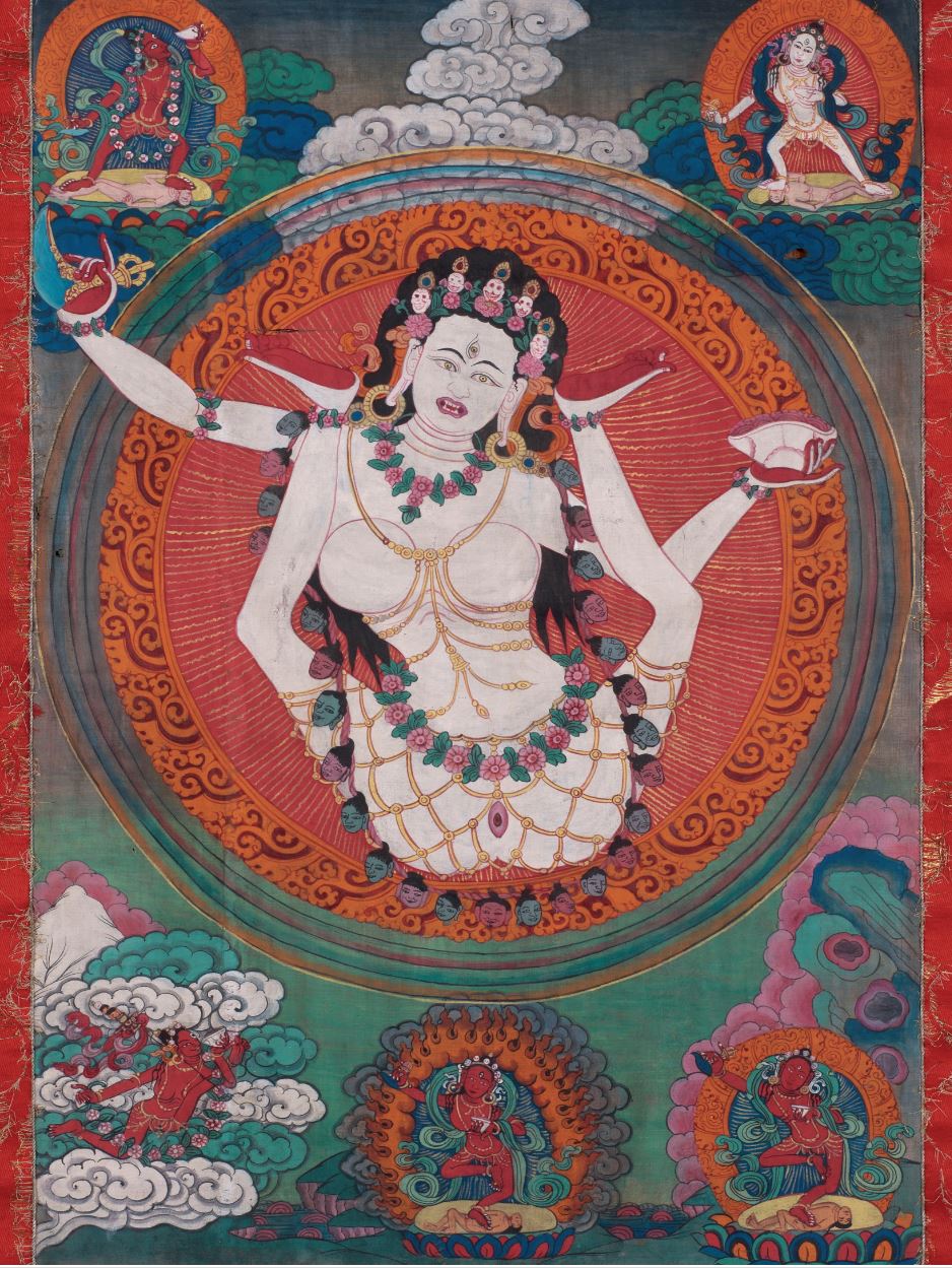 金刚无我母乃藏传佛教密续重要的女性神祇,在《喜金刚本续》中,她与本尊喜金刚呈“双运”姿态,是无上智慧的化身。同时,金刚无我母也作为萨迦派道果传承中的圣使之一而受到崇拜,其单尊形象应运而生。画面正佛母全身袒露,挂满股饰。两臂伸展右手持钺刀,左手持嘎巴拉碗,身体呈无我佛母独有姿态。背后为红色莲花轮,四周众佛母护法眷属围绕,题材独特。在今西藏江孜县境内的白居寺集会殿二层道果殿中存有一组创作于15世纪左右的萨迦派道果传承祖师泥塑,金刚无我母便位居其中。相同的情况还出现在现今保存于敏珠林寺、原属扎塘寺的一组创作于16世纪的萨迦派道果传承祖师铜像中。