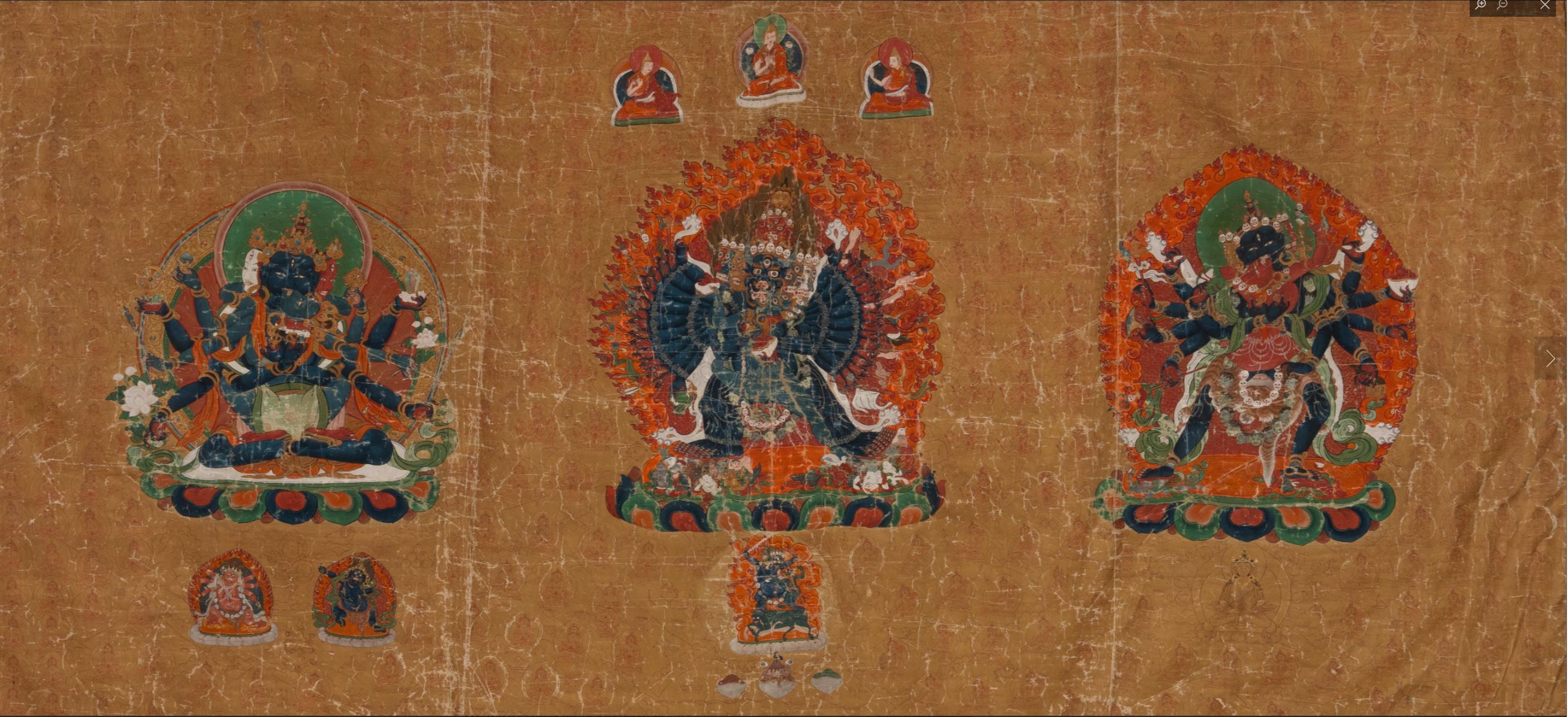 This large horizontal depicts three boldly rendered tantric deities on a gold ground. At the center is Ekavira Vajrabhairava with his consort Naro Dakini framed in an aureole of licking flames. Above the central figure, in smaller scale, sit three Geluk lamas. Below, standing on the spine of a buffalo is protector Yama Dharmaraja. To the left sits Guhyasamaja in union with his consort Sparshavajra surrounded by halos of red and green encompassed in a rainbow-hued orb. Protecting this deity are small representations of Hayagriva and Vajrapani. Blue-bodied Chakrasamavara stands to the right, wearing garlands which wrap around his red-bodied consort, Vajravarahi. Below, the peaceful Buddha Amitabha sits in gold. Repeated images of the goddess Tara, outlined in red ink, are set against the gold background.