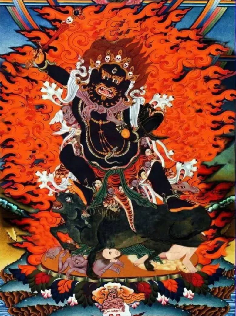 金刚大威德,是指世尊成等觉后,入定“战胜魔军”三摩地,从身、口、意变化出阎魔敌群,被一一征服,并宣说续部。其续部有《十万续》、《分别心三百续》和《三千六百续》。大成就者拉里达.班杂尔前往与邬金,接受智慧空行女灌顶,七天之内从法藏中掌握许多续部,并传播之。在藏王赤松德赞时,除少部分因其玄密的缘故而未能面世外,大部分都得到译传。后宏期,出现了热.多杰扎巴等许多派别。阎魔敌方面主要推行者是阿底峡、那措译师等。金刚大威德是文殊善萨的化身,住在南瞻部洲外海底下七层之处。一时,鬼八部欺压众生。文殊变成八面忿怒神,鬼众见状害怕,发誓充当文殊之护法神。如修持此尊,可获得殊胜成就,同时可启迪智慧,战胜灾害。总之,与文殊善萨身、口、意的事业功德毫无二致。